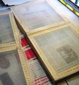 Después de que la película esté seca, se despega el respaldo de acetato. Para imprimir se coloca el papel debajo de la trama, con la tinta acumulada en el lado superior del bastidor.