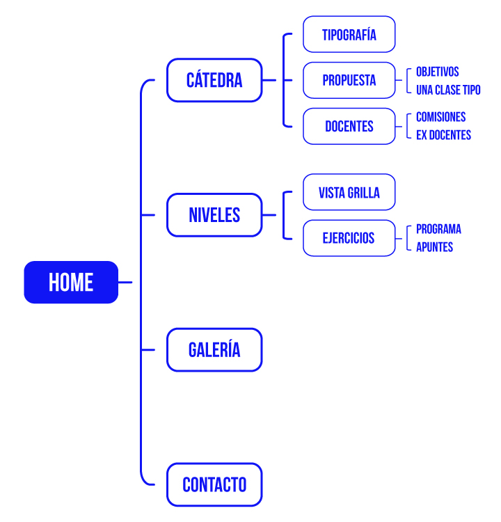 Mapa de Sitio_ Home Cátedra - Tipografía - Propuesta -- Objetivos -- Una clase tipo - Docentes - Comisiones - Ex-Docentes Niveles - Vista grilla - Ejercicios -- Programa -- Apuntes Galería Contacto VER JPG