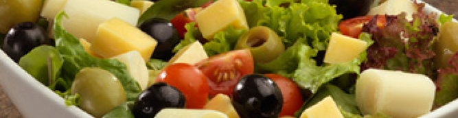 Lechuga crespa verde, tomates cherrys, aceitunas verdes, aceitunas negras, cebolla, champignones.