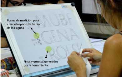 Apropiación del recurso caligráfico permitiendo la comprensión del comportamiento del trazo gradual, la forma subyacente y la construcción del ductus de cada tipo de escritura. Los diferentes bloques de texto permiten la asociación entre el color de los signos y las relaciones espaciales que determinan el color del bloque.