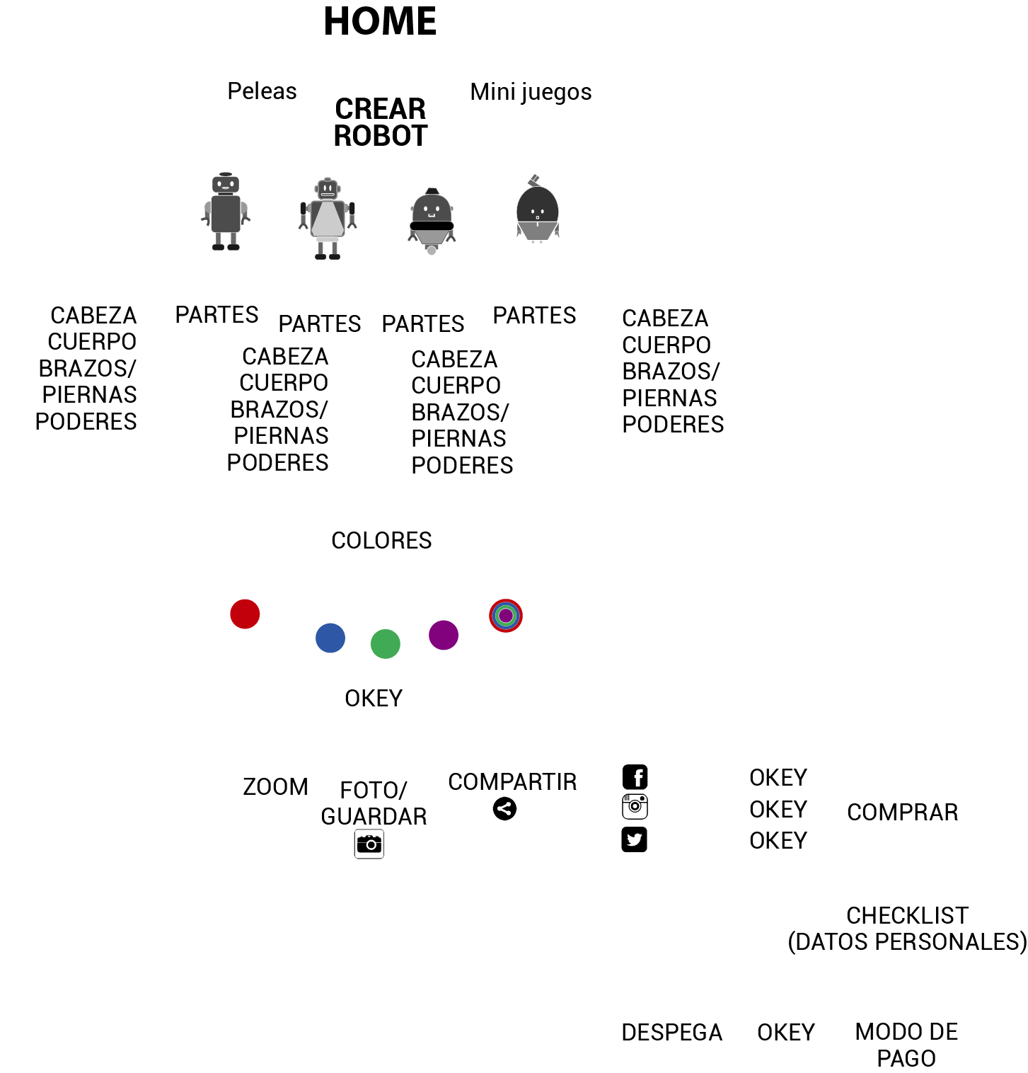 La app tiene un manejo simple y mucho diseño visual, ideal para niños y jóvenes. A través de ella, el usuario se registra y tiene la posibilidad de diseñar su propio robot. Como actividades secundarias, la app cuenta con minijuegos simples y la posibilidad de utilizar los robots creados en peleas online con otros usuarios. El robot se arma en base a cuatro modelos prediseñados, se eligen sus colores, sus poderes, etc. Una vez finalizado el diseño del robot, se selecciona el'origen' del mismo, de qué lugar vendrá (la Luna, Júpiter o Urano). Los robots llegan al usuario en un packaging diseñado en base a qué lugar de origen se seleccione. Una vez marcado esto, el niño tiene la posibilidad de sacarle fotos a su creción y guardarlo, además de compartirlo en redes sociales -este último paso es obligatorio-. Al compartir el contenido, se elige el medio de pago y se 'lanza el cohete' a buscar el robot a su lugar de origen. Aquí comenzará una cuenta regresiva donde el usuario podrá ver cuánto tiempo falta para que le entreguen el robot en su domicilio. A su vez, el niño cuenta con un perfil propio donde puede ver sus robots creados, además de su registro con estadísticas de las peleas y minijuegos en los que participe.