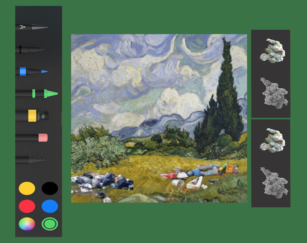 Un juego para convertirnos en artistas a traves de pantallas! Interveni las obras de los artistas mas historicos reflexionando acerca del medio ambiente. La idea es que tu intervencion demuestre lo que hubiese pasado con las obras y sus paisajes si la contaminacion ambiental estaria presente.