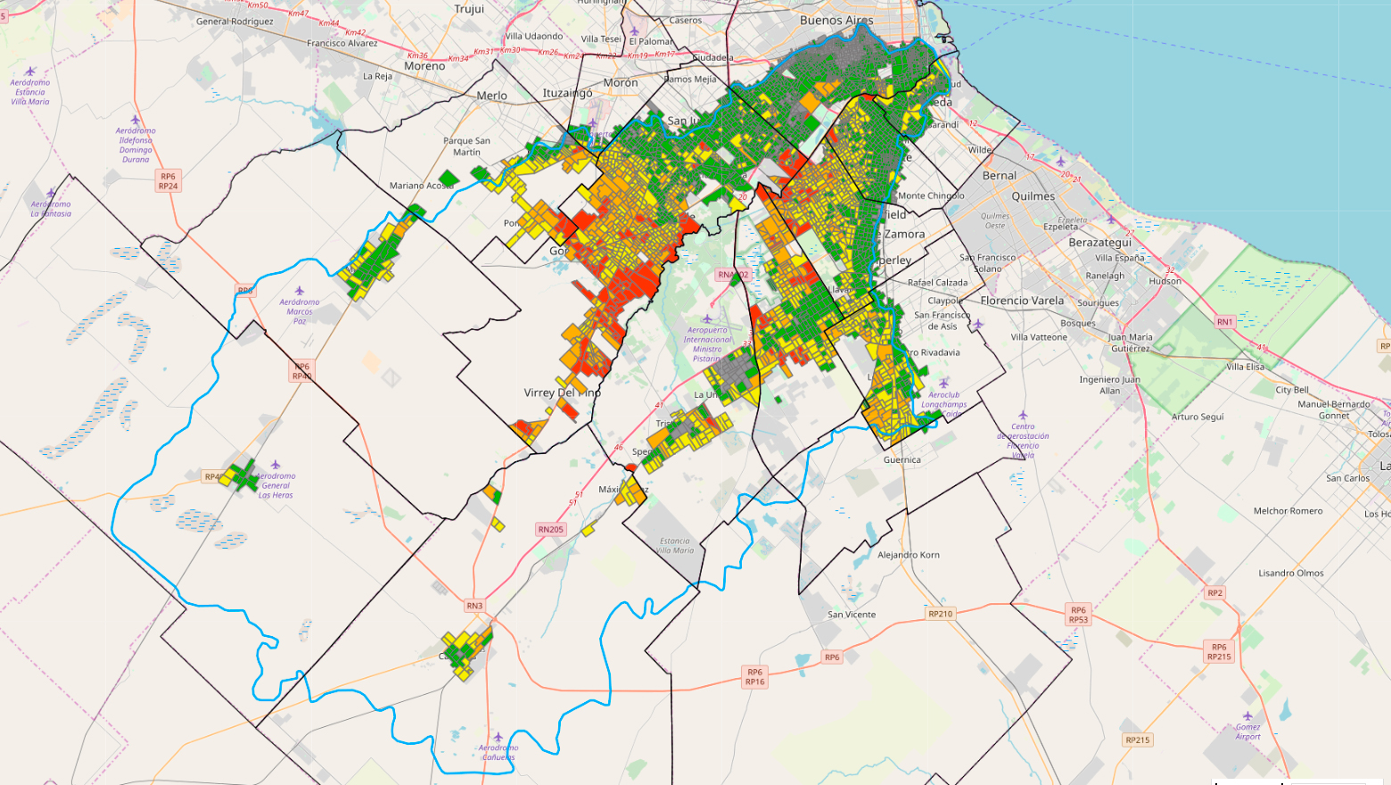 Para poder tener una dimensión real de cómo afecta la contaminación de la Cuenta Matanza Riachuelo a sus habitantes, elaboramos un mapa de riego ambiental que contempla las clases de contaminación presentes, los tipos de desarrollo urbano y las mediciones de impacto de los vertidos en el agua, en el aire y en el suelo. Esta herramienta nos permite establecer mejor las prioridades. El mapa de riesgo ambiental se puede consultar públicamente en la plataforma abierta www.mapas.acumar.com